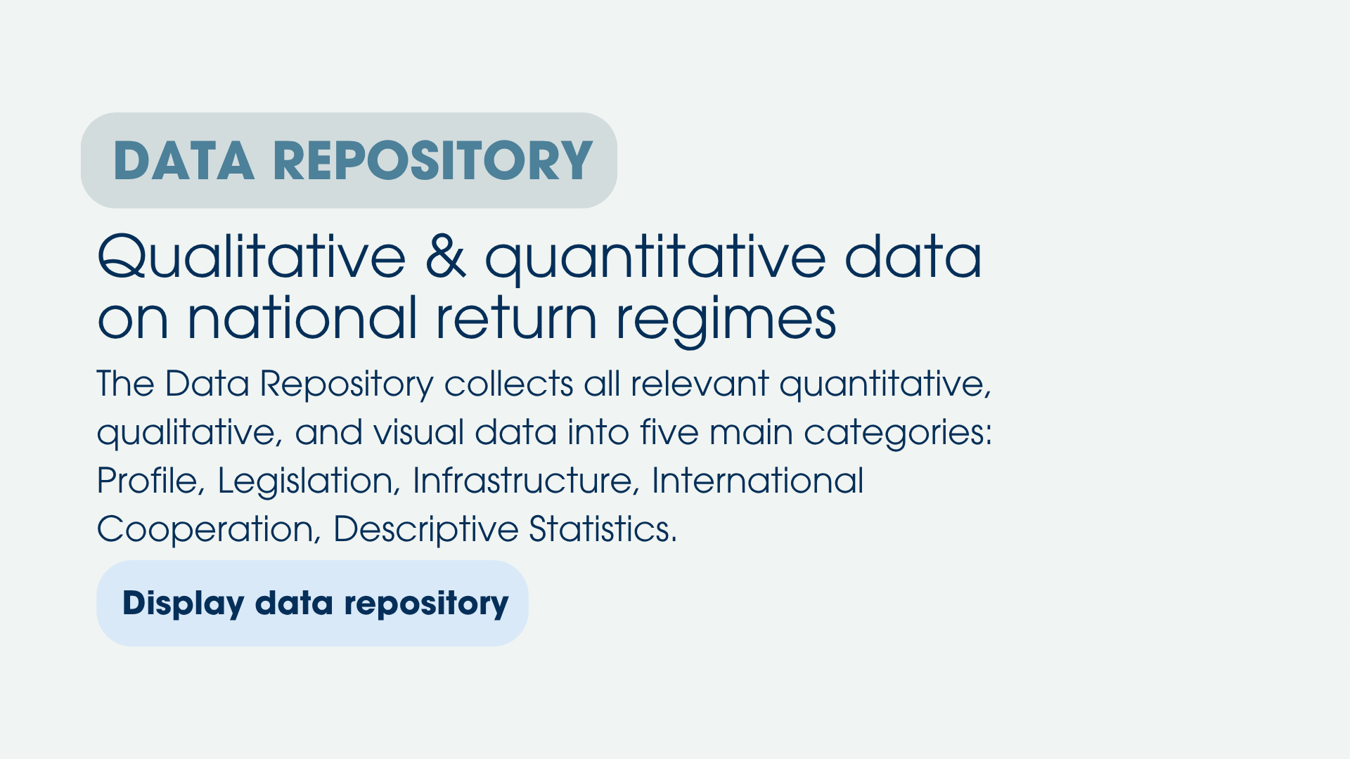 Designed to be open access and user-friendly, the Data Repository collects all relevant quantitative, qualitative, and visual data into five main categories, ensuring a unified and organized presentation for those interested in return related data: Profile, Legislation, Infrastructure, International Cooperation, Descriptive Statistics.