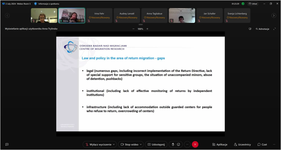 As Anna emphasized, Poland's position on the Schengen Area's external border with three non-EU countries makes it crucial in implementing the EU return policy. However, as the last few years have shown, Poland is taking excessive measures in terms of changes to return law and its practice. In April 2023, the government introduced an amendment to the Act on Foreigners of 2013, which caused a more restrictive return policy. It can be seen as a continuation of the previous legal changes linked to the humanitarian crisis on the Polish-Belarusian border observed since mid-2021 and an attempt to deprive migrants of access to effective remedies. As a result, the full competence to conduct return proceedings was concentrated in the hands of the Border Guard, the period for filing an appeal against the return decision was shortened, and the suspensive effect of filing a complaint to the administrative court was lifted. The aim of the presentation was to examine how the recent changes in the national law would affect the protection of the rights of irregular migrants, recognition of the appeals and the influence on the willingness to comply with the decision of return. Legal and policy analysis provided during her presentation included, among others, the Act on Foreigners, samples of decisions issued by the competent bodies, the available court judgments regarding the return process, and return-related statistics. The presented results enabled a preliminary evaluation of the recent amendments' compliance with the 2008 EU Return Directive.