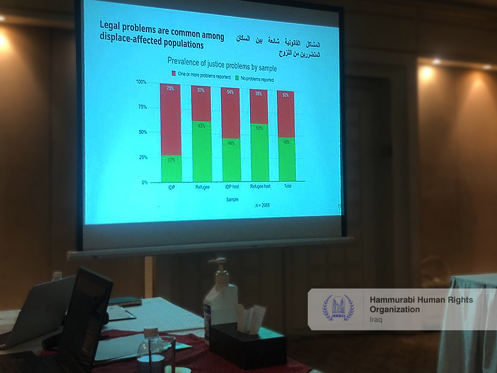 The agenda of the workshop included topics related to the results of surveys on the justice needs of refugees, displaced persons, and host communities in Iraq, which include resolving conflicts, disputes, or grievances that can be legally resolved to achieve fair outcomes.