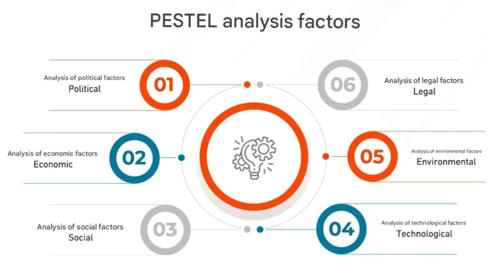 PESTEL: P: Political; E: Economic; S: Social; T: Technological; E: Environmental; L: Legal Source: Corporate Finance Institute. PESTEL analysis – Understanding external factors affecting business. Retrieved from: https://corporatefinanceinstitute.com/resources/management/pestel-analysis