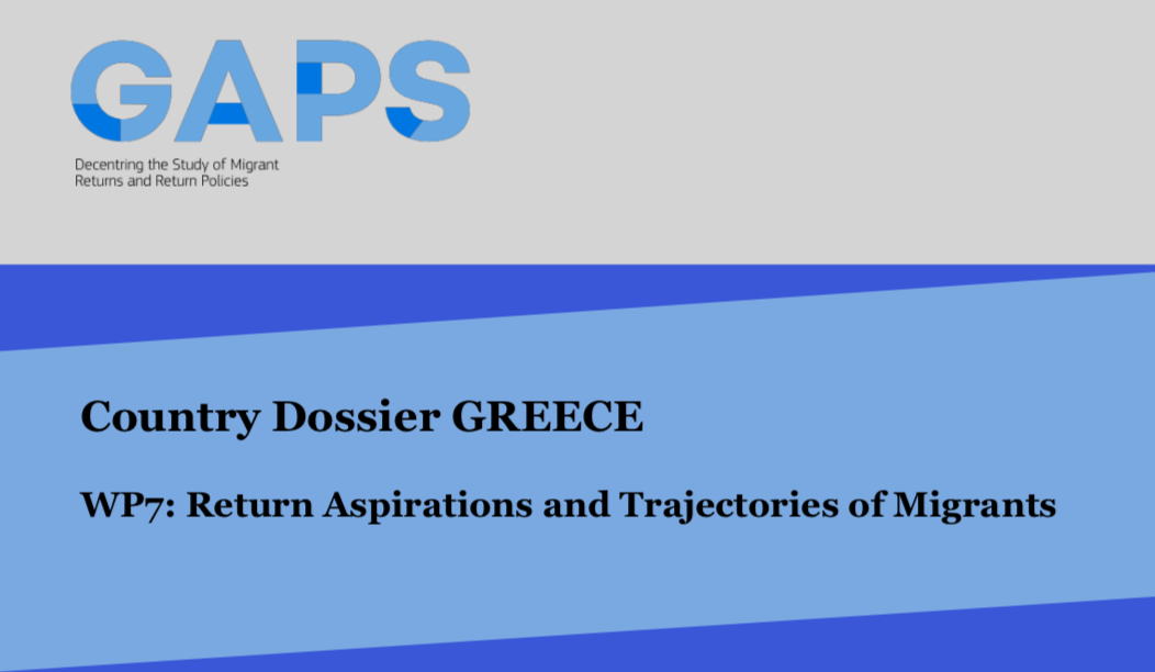 This Country Dossier focusing on Greece is part of Work Package 7 of the GAPs project. It examines migrants’ experiences in Greece, both as a settlement and transit country, focusing on shifting aspirations, social integration, and mobility decisions, especially as regards the ‘pre-return phase’. The ‘pre-return phase’ is perceived broadly, to include migrants who are found in the ‘spectrum of risk of return’, including those who are at close or mid-term risk of return, either today or in the near future. Moreover, recognising that return is part of complex, non-linear migration trajectories, the dossier also highlights patterns such as onward movements, re-orientations, periods of rest, and intermediate settlements. These trajectories include multiple returns to countries of origin, re-migration to Greece, or circular migration. Migrants’ return experiences encompass both forced and assisted voluntary returns, viewed as part of a continuum of coercion rather than a strict dichotomy.